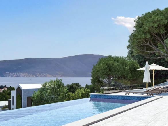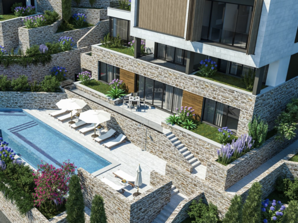 Type 1, Exclusive Apartments: A 145m2 retreat with 3 bedrooms, 4 bathrooms, and a bonus 21m2 open terrace. Revel in panoramic Bay of Kotor views through expansive windows. Enjoy exclusive access to a large swimming pool, recreation area, underground parking, and an elevator. Your perfect abode boasts A+ energy rating. From €500,000.