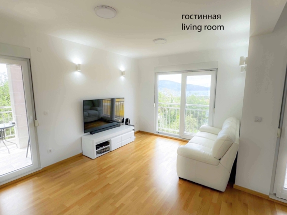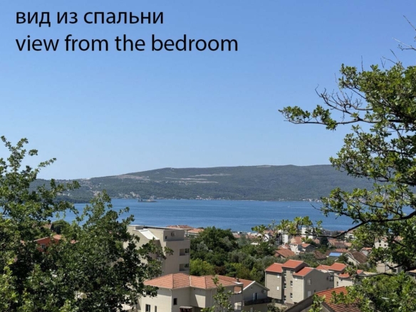 The apartment is in a three-storey building. It was built in 2022. First floor is kitchen and living with a bathroom. The second floor features two bedrooms and a bathroom. The apartment occupies the entire floor. Two balconies, two bedrooms, two bathrooms. Panoramic floor-to-ceiling windows in each room with a view of the Tivat Bay (blinds + mosquito nets on the windows). On the ground floor there is a spacious garage for two cars (the apartment belongs to one place). In the garage there is a separate storage room of 7 sq.m. There is a guest parking next to the house. Each room has air conditioning.