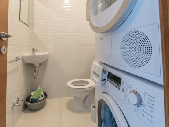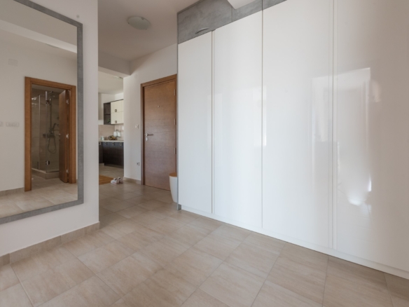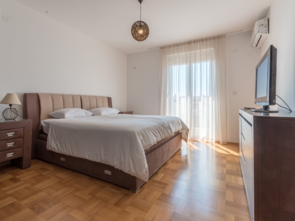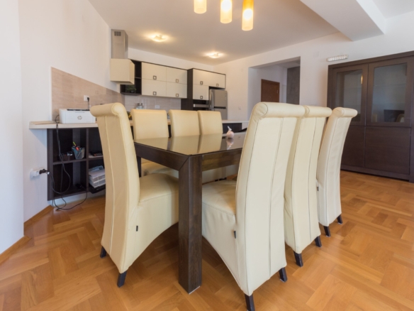 The apartment is bright and airy with open plan lounge, kitchen and dining area, and equipped with modern fixtures and fittings. The apartment is sold furnished with one garage parking. There are great views over Topla and the bay. There are two bedrooms each with its own terrace, a shared bathroom and guest WC.